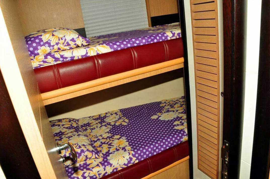 She can accommodate a party of 19 persons whilst the 3 cabins can accommodate 6 guests for sleeping.